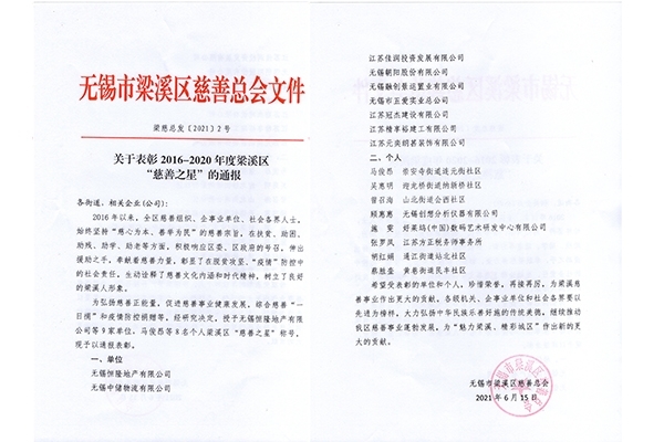 此次無錫市梁溪區慈善總會為表彰2016至2020年間,在扶貧、助困、助殘、助學、助老、“疫情”防控中做出貢獻的單位及個人授予梁溪區“慈善之星”稱號,以通報表彰。創想儀器顧惠惠女士有幸得此殊榮,作為一名企業領導人,在“疫情”防控中奉獻自己的力量是應盡的責任。我們將珍惜榮譽,再接再厲,為梁溪慈善事業作出更大的貢獻。